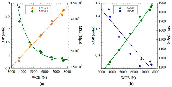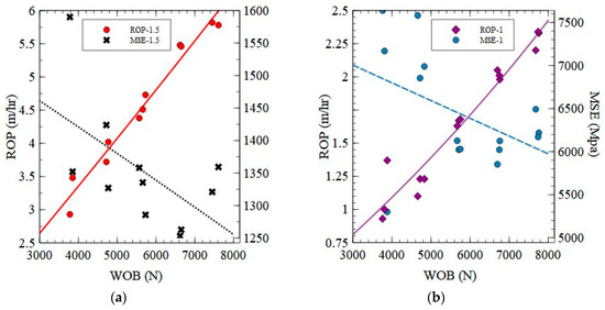 The Mechanical Specific Energy (MSE) was calculated by using Equation (2), which offers valuable information about the mechanical work required to excavate a unit volume of rock during drilling. Teale’s equation enables a comprehensive assessment of energy efficiency in the drilling process.