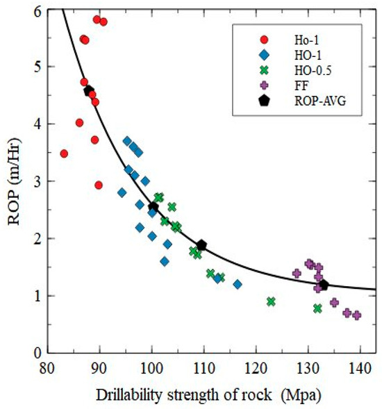 The modified Maurer (1962) model is a useful tool for determining the effective rock strength (S) based on the drilling rate (ROP) data obtained under different pilot hole diameters [18]. The calibrated model can be used in Equation (3) to estimate effective rock strength (S) for other pilot hole diameters.