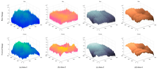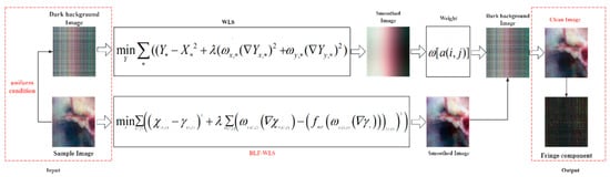 The sample image is captured simultaneously with the reference dark background image, which is consistent with the hyperspectral image in both the spatial and spectral dimensions. Since the varied acquisition environment will also affect the detector’s non-uniformity error, both the sample picture and the dark background image must be acquired simultaneously. Separating the edge and fringe noise of the reference image as much as possible is essential for removing non-uniform fringe noise based on the reference. Many papers have been published on the removal technology of edge extraction [14,33]. These methods usually adopt a threshold to distinguish between edge and fringe noise in the image to avoid edge blurring. However, this method incorrectly removes the weak edges of the image and preserves the strong fringe noise. WLS [34] is a good edge-preserving picture filtering and denoising technique. We smooth the reference dark background picture using the WLS algorithm, then subtract it from the original dark background image to obtain the reference dark background image’s edge component in order to more effectively separate the edges of the reference dark background image. The algorithm for removing instrument fixed-mode noise () is shown in Formula (8):