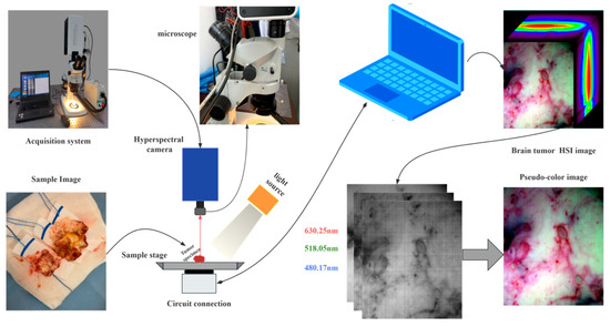 All of the datasets of hyperspectral brain tumor tissue images are actual experimental data that were gathered in conjunction with The Second Affiliated Hospital of the Fourth Military Medical University (Tangdu Hospital). In order to obtain hyperspectral brain tumor tissue images with a spectral dimension of 258 and a spatial dimension of 700 × 600, the surgically excised tumor tissues were photographed using the spatial dimensional push scan hyperspectral imaging technology that we created. Consequently, each sample image has a data size of 700 × 600 × 258. When we obtained the sample image, we also collected a dark background image that was the same size. Typically, when a brain tumor is removed, normal brain tissue is also present in addition to the malignant tissue. We currently have 39 HSI datasets of brain tumor images from 15 distinct patients (still being collected continuously). Table 1 lists the specifications of the employed hyperspectral imaging system, and Figure 2 displays an illustration of the acquisition procedure. The specific practice is to obtain hyperspectral images of fresh brain tissue after the micromagnification of fresh brain tissue specimens cut by doctors during surgery by the spatial dimensional thru-scan hyperspectral imaging system developed by our research group, and the light source used for irradiation is a halogen light source. In order to facilitate observation, 630.25 nm (band 105), 518.05 nm (band 56), and 480.17 nm (band 39) were selected as red, green, and blue three-channel synthetic pseudo-color images.