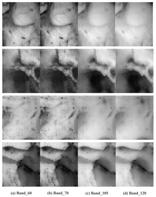The hyperspectral image of the original brain tumor is in Figure 3. It is clear that the original image typically contains non-uniform fringe noise that permeates the entire piece of data and travels along the entire band in the same direction. The center band’s fringe components are fewer, the fringe components of the other bands vary, and the front and back bands are significantly impacted by fringe noise. Figure 4 shows the image following the proposed way of removal. As can be observed, there is less loss of image detail and the non-uniform fringe noise disappears.