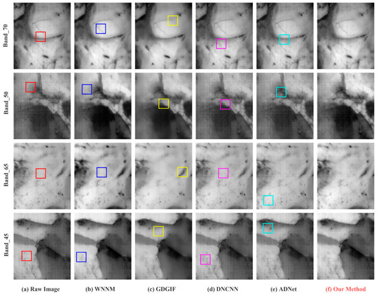 Two traditional denoising methods (WNNM [34] and GDGIF [35]) and two neural network denoising algorithms (DNCNN [29] and ADNet [30]) were chosen for the experiment since they had better image denoising effects. The denoising effect of the algorithm is evaluated subjectively through two display modes of the single-band image and false color image. The qualitative evaluation indices include the subjective visual effect of human eyes and the column mean curve of the image. Figure 6 shows the effect of several methods on noise removal in some bands of hyperspectral images. The part specially marked is for the biological detail characteristics of tumor hyperspectral images, which plays an important role in the subsequent image processing. Therefore, cleaner noise removal and clearer details result in the best experimental results being obtained.