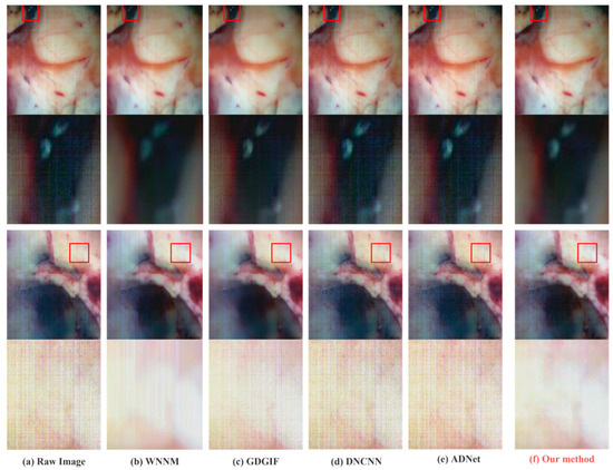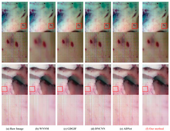 The denoising principle of the transform domain algorithm based on mathematical statistics is to convert the image from the spatial domain to the transform domain by a certain transformation method, then denoise the image in the transform domain, and, finally, reverse-transform the processed result to the spatial domain to complete the denoising [15]. Statistical methods mainly include low-rank and sparse representation [16,17], principal component analysis [17], and adaptive filtering [18]. These techniques presuppose that the target pixel signal distribution is adjusted to the same reference distribution and that the signal response distribution of each detector is the same. A different kind of approach is based on filtering, which is further separated into global and local filtering. While global filtering offers the advantage of maintaining more of the image’s information, local filtering is more computationally efficient. Wang [19] et al. applied bilateral filtering to infrared images, which can effectively smooth image noise. Other filtering methods, such as wavelet-based filters [20,21,22], or finite impulse response filters [23], remove fringe noise by constructing filters at a given frequency. In addition, Chen Boyang proposed an adaptive wavelet filter to quickly and accurately learn the appropriate wavelet filtering coefficients [24]. Ende Wang proposed a fringe removal algorithm based on wavelet decomposition and gradient equalization [25]. However, no filter can completely accommodate all frequencies of fringe noise, and certain picture components that contain information will unavoidably be filtered out, leading the clean image that results to lose some of its information or generate “artifacts”. In the field of medical hyperspectral diagnosis, the decline in image quality will lead to the loss of biological tissue image information, which seriously affects the accuracy of subsequent classification diagnosis.