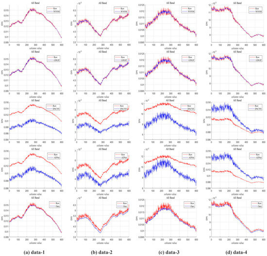 The mean curve of the original noise-filled image column is frequently too rough, with several sharp points and extraneous peaks and valleys that complicate feature extraction and classification tasks and reduce processing accuracy. Therefore, the main objective of removing non-uniform noise is to remove this extra sharpness, making the curve as smooth as possible while maintaining the original trend, and the secondary objective is to avoid over-smoothing that would result in the loss of the curve’s details. The reflectivity value must not deviate too much from the original image in order to accomplish the aforementioned goals. Since medical hyperspectral images have dozens or even hundreds of bands, a single column mean curve for a single-band image can only reflect the non-uniform band noise removal results of a single image. In order to reflect the denoising effect of different non-uniform strip noise removal algorithms on all band images, in the experiment, the spectral dimension average of the column mean values of all bands may accurately indicate the influence of all bands’ adjustment. Figure 9 shows the comparison of the mean column mean curve before and after denoising for the whole band.