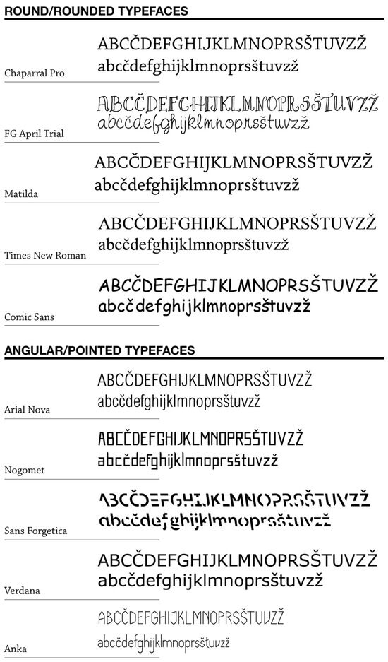We categorised typefaces into two groups based on the shape of their main strokes, transitions, and stroke ends (serifs). Typefaces can be described based on their shape characteristics: the form of main (especially rounded) strokes, transitions between strokes, and stroke endings, categorising them as either round/rounded or angular/pointed. Round/rounded typefaces included those with letters that have softer or more organic shapes—forms that resemble natural shapes such as waves, curves, and shapes found in the natural environment. On the other hand, angular/pointed typefaces include those with letters of a more technical design, featuring more angular and sharp forms. Typical typefaces that could be classified as round/rounded include typefaces with characteristics of venetian, garalde, and transitional typefaces [93,94]. Typefaces that could be classified as angular/pointed include some typefaces with characteristics of didone, slab serif, and sans serif typefaces [93,94].