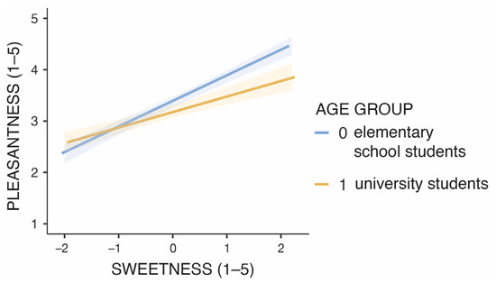 In the first model, we investigated the relationship between the ratings of typeface sweetness and pleasantness to ensure that higher perceived (imagined) sweetness corresponds to more pleasant feelings, as expected from the literature on cross-modal interactions. Typeface pleasantness was predicted based on typeface sweetness (entered into the model as an interval predictor, i.e., level-1 covariate; the values were centred within individuals). To account for possible differences between children and adults in the strength of the relationship between typeface pleasantness and sweetness, we also included the age group as a level-2 factor (a factor with two levels, i.e., 0—elementary school students; 1—university students) in this model.