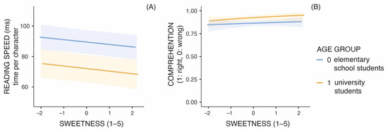 Finally, we analysed the relationship between the ratings of typeface sweetness and two indicators of reading fluency in both age groups (Figure 6, Table 3 and Table 4). Accounting for the between-subject differences by adding random intercepts in the model for predicting the reading speed improved the model fit significantly (varbetween subjects = 739, varwithin subjects = 232, ICC = 0.761, LRT(1) = 913, p < 0.001). There were large differences in reading times between individuals of the same age. Meanwhile, the between-subject variance in text comprehension was low (varbetween subjects = 0.00, varwithin subjects = 1.00, deviance = 586.1, χ2/df = 1.01, p = 1.00). Concerning the fixed effects in the models, there was no interaction between the age group and the sweetness of the typeface in the prediction of the reading speed (Table 3) and the prediction of text comprehension (Table 4). The relationship between the ratings of typeface sweetness and reading speed or text comprehension was therefore similar for younger and older readers. The sweetness of the typeface had a statistically significant relationship with the reading speed, an indicator of reading fluency—the sweeter the typeface, the shorter the reading time per character (Table 3, Figure 6A). The relationship between the rating of the sweetness of the typeface and text comprehension did not reach statistical significance (Table 4), although a similar trend was observed—the higher the rated sweetness, the slightly better the text comprehension (Figure 6B). A clear and statistically significant effect of age group on both reading fluency and text comprehension was also observed—elementary school students read more slowly than university students and showed poorer text comprehension, which was to be expected as they are less experienced readers, and their cognitive abilities are less developed.