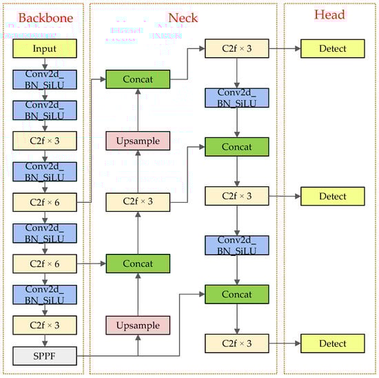 As illustrated in Figure 1, the YOLOv8 architecture is composed of three primary parts: the backbone, the neck, and the head. The backbone employs the CSPDarkNet structure [20], which consists of various layers such as Conv, C2f, and Spatial Pyramid Pooling Fast (SPPF) to extract image features. The Conv layers are responsible for extracting fundamental features, utilizing SiLU activation function alongside batch normalization to normalize feature representations. The C2f module further captures detailed features to enhance the model’s ability to discern finer details, while the SPPF layer aggregates information from different scales through multi-scale pooling, strengthening the model’s robustness when detecting objects of varying sizes.