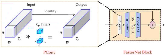FasterNet is a new type of neural network introduced at the 2023 CVPR conference. Its lightweight design enables faster detection speed and higher accuracy across various devices, including GPUs, CPUs, and ARM processors. The main benefit of FasterNet stems from its PConv technology, which enhances the extraction of spatial features by minimizing unnecessary computations and improving memory utilization [26]. The design of the network is presented in Figure 3.