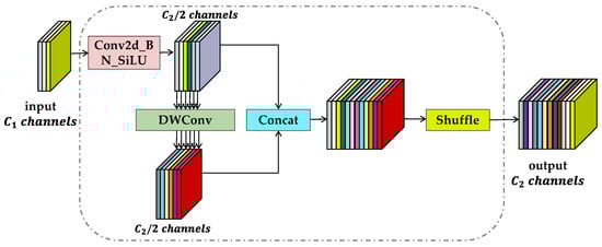 In order to overcome these challenges, this paper presents a more efficient and compact GSConv structure, as illustrated in Figure 4. The input feature map is first downsampled using standard convolution to generate a feature map with half the number of channels as the final output feature map. Then, a depthwise convolution (DWConv) module processes these feature maps, and the two processed results are concatenated along the channel dimension. Finally, a shuffle operation is applied to produce the final output feature map. The main advantage of the GSConv structure is its ability to maintain high detection accuracy while providing faster processing speed and a more compact model size.