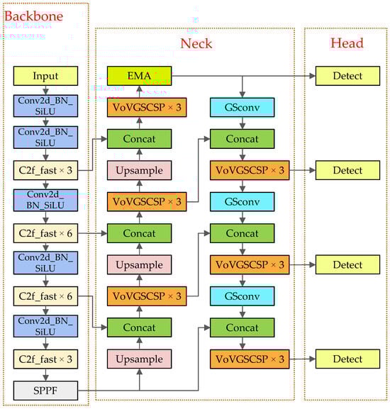 In the neck, lightweight GSConv and VoVGSCSP modules have been introduced as feature extraction units, aimed at capturing critical features more efficiently, thus reducing the overall computational load. Additionally, the EMA attention mechanism has been integrated within the neck to further enhance the model’s sensitivity to key features, improving its accuracy in capturing essential features in infrared images.
