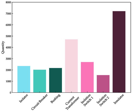 The image dataset used for model training was obtained from Roboflow [35], and the images were captured using the FLIR T600 single-band infrared thermal imager (FLIR, Wilsonville, 2010, USA). This thermal imager operates within a spectral range of 7.5–14 μm, belonging to the long-wave infrared (LWIR) region, which is well-suited for capturing thermal radiation emitted by objects with temperatures typical in industrial environments. With a spatial resolution of 640 × 480 pixels, the thermal imager enables detailed thermal imaging of substation components. The dataset includes images from multiple substations, rather than a single site, focusing on seven types of equipment: isolator, circuit breakers, bushings, current transformers, isolation switch 1, isolation switch 2, and insulators. A total of 1670 images were collected, covering both normal operating conditions and fault states, thus reflecting a wide range of scenarios encountered in practical applications. The dataset used in this study is available for download from [36] for further research and applications.