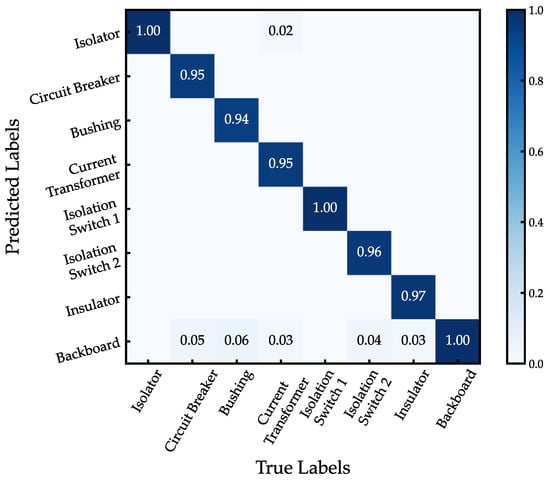 The results of the experiment reveal that the YOLOv8_Adv model shows a remarkable performance in classifying infrared images for substation electrical equipment, with an average accuracy rate of 96%. The model attained high accuracy across various equipment categories, verifying its robustness and effectiveness. Specifically, the classification accuracy for the isolator and isolation switch 1 reached 100%, demonstrating its exceptional precision and reliability in recognizing these devices and effectively handling complex infrared backgrounds. For the circuit breakers, the model achieved an accuracy of 95%, while for the bushings, it reached 94%, showing that YOLOv8_Adv maintains strong recognition performance for medium-sized devices with a low error rate. For the isolation switch 2 and insulators, the model’s accuracy reached 96% and 97%, respectively, further demonstrating its accuracy in detecting smaller devices.
