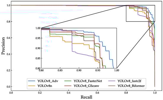 Figure 11 presents a comparative analysis of the P–R curves for the improved YOLOv8_Adv model against various baseline models.