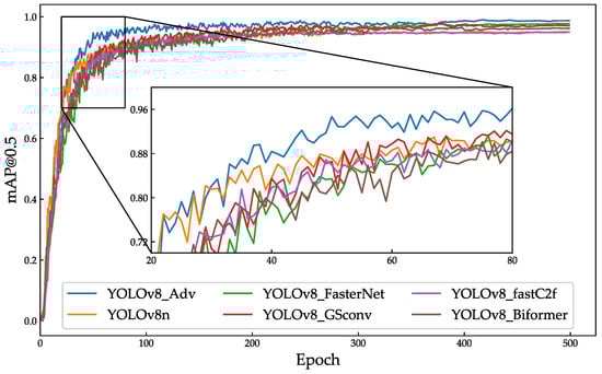Figure 12 illustrates the comparison of mAP@0.5 curves between the improved YOLOv8_Adv and the other baseline models. The results show that after training iterations exceed 65 epochs, the average precision of the YOLOv8_Adv significantly outperforms the baseline models. After 500 iterations, the mAP@0.5 of YOLOv8_Adv increased from 94.9% to 98.7%, marking an improvement of 4.0%.