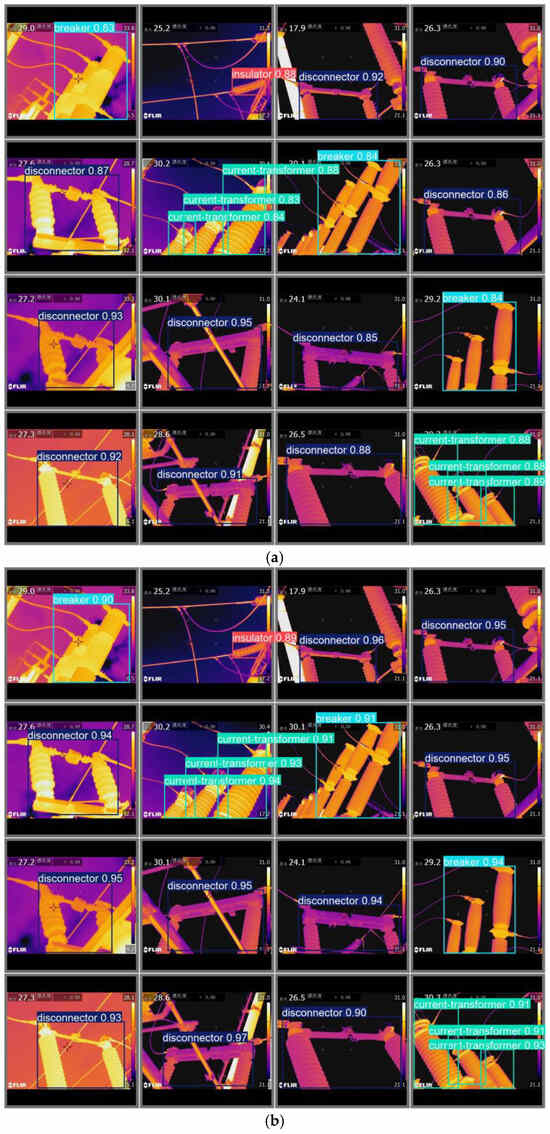 These results indicate that the YOLOv8_Adv model, with optimized backbone, neck, and head structures, has effectively enhanced accuracy and recall in small device recognition, especially in complex infrared backgrounds with multiple-object interference, while maintaining high detection precision. Overall, the YOLOv8_Adv model meets the high-precision requirements of real-world engineering tasks in the infrared detection of electrical equipment, making it particularly suitable for infrared image monitoring in substations and facilitating the automated monitoring and maintenance of equipment conditions.