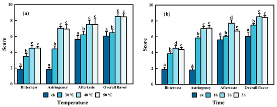 Sensory scores of the tea extracts for the different enzyme reaction temperatures (a) and times (b). ck represents the sample that has not been treated with the enzyme. The error bar represents the standard error of the mean, and by the LSD test, the average of different lowercase letters indicates a significant difference (p < 0.05).