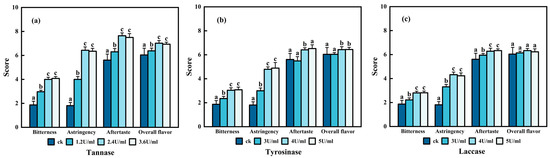 Sensory scores of tea extract for different enzyme treatment concentrations. a, b, and c represent tannase (a), tyrosinase (b), and laccase (c), respectively. ck represents the sample that has not been treated with the enzyme. The error bar represents the standard error of the mean, and by the LSD test, the average of different lowercase letters indicates a significant difference (p < 0.05).