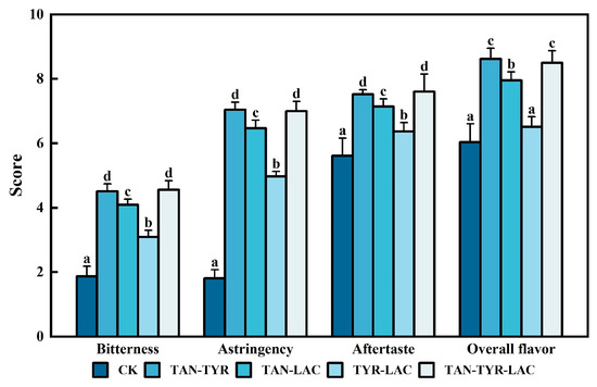 Sensory scores of the tea extracts for the different enzyme compound methods used. ck indicates the sample that has not been treated with the enzyme; TAN-TYR indicates tannase 2.4 U/mL + tyrosinase 4 U/mL; TAN-LAC indicates tannase 2.4 U/mL + laccase 4 U/mL; TYR-LAC indicates tyrosinase 4 U/mL + laccase 4 U/mL. TAN-TYR-LAC indicates tannase 2.4 U/mL + tyrosinase 4 U/mL + laccase 4 U/mL. The error bar represents the standard error of the mean, and by the LSD test, the average of different lowercase letters indicates a significant difference (p < 0.05).