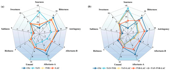 Regarding the results obtained from the electronic tongue detection of the tea extracts, the properties of the enzyme-treated samples were significantly different (p < 0.05). When the three enzymes were each individually applied to the tea extract, tannase had the greatest effect on the taste of the tea extract, with the sourness and sweetness increasing by 31.39% and 10.02%, respectively, while the bitterness, astringency, bitterness aftertaste, and astringency aftertaste decreased by 29.25%, 37.63%, 37.31%, and 62.53%, respectively. The umami and richness were also reduced by 23.56% and 25.71%, respectively. Tyrosinase and laccase had similar effects on the taste of the tea extract, but their impact was much lower than that of tannase (Figure 4a). Among the samples treated with complex enzymes, the improvement effects of TAN-TYR, TAN-LAC, and TAN-TYR-LAC on the tea extract taste tended to be consistent, with the best effect being observed for TAN-TYR. This enzyme combination increased the sourness and sweetness by 34.70% and 7.72%, respectively. The bitterness, astringency, bitterness aftertaste, and astringency aftertaste decreased by 35.05%, 48.21%, 51.54%, and 69.92%, respectively. Umami and richness decreased by 21.94% and 26.67%, respectively. The effect of TAN-LAC and TAN-TYR-LAC on the reduction in bitterness and astringency was slightly lower than that of TAN-TYR (Figure 4b), likely due to the action of laccase. The precursor oxidation products of thearubigins are theaflavins, theacitrins, and theanaphtoquinones, among others. When laccase is added to the tea extracts, due to its broader substrate specificity, the content of thearubigins is likely to increase; moreover, thearubigins are also one of the main contributors to the bitterness of tea [17]. The increase in sourness and sweetness is probably related to a change in the contents of gallic acid and glucose. When tannase acts on the ester bonds to break them, gallic acid and a small amount of glucose are produced [32]. The results of the electronic tongue test were generally consistent with the sensory score ones.