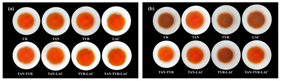 The status of tea extracts stored at room temperature and at 4 °C for 24 h are shown in Figure 5. The weight of tea cream in all enzyme-treated samples was significantly lower than that in the control group (p < 0.001). When comparing the weight of tea cream obtained after the treatment with the three single enzymes (TAN, TYR, and LAC), tannase had the best effect on reducing precipitation, with a tea cream weight of 2.21 mg/L, which was 91.46% lower than that obtained in the control group (Figure 6). Jie QiongWang et al. also found that tannase can reduce the precipitation amount in green tea concentrate by 74.63% and improve the storage taste of green tea concentrate [19]. According to the results obtained for the combined enzymes, TAN-TYR-LAC showed the greatest decrease in tea cream weight (0.85 mg/L), corresponding to a 96.71% reduction compared with that of the control group. This was followed by TAN-TYR and TAN-LAC, which reduced the tea cream weight by 93.39% and 84.81%, respectively, compared with that of the control group. Among the combination enzymes, TYR-LAC led to the smallest tea cream weight reduction, with a decrease of only 60.11% compared with that of the control group (Figure 6). Gallated catechins, such as EGCG and ECG, contain more galloyl and B-cyclohydroxyphenyl groups, which easily bind to caffeine and other compounds, making them more likely to form precipitates than non-gallated catechins, such as EGC and C [19]. By reacting with tannase, tyrosinase, and laccase in tea extracts, gallated catechins are likely transformed into non-gallated catechins, thus weakening the binding ability of proteins and caffeine in the tea extracts containing gallated catechins [25]. Consequently, the tea cream weight is reduced. This is likely the reason why enzyme treatment positively affects the clarity of tea extract and the formation of tea cream.