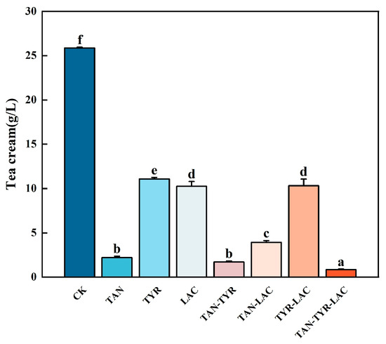 Weight of the tea cream in the enzyme-treated tea extracts. The error bar represents the standard error of the mean, and by the LSD test, the average of different lowercase letters indicates a significant difference (p < 0.05).
