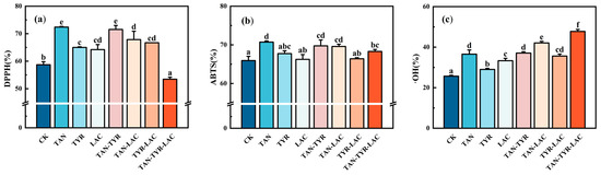 Free radical scavenging rate of DPPH (a), ABTS (b), and (c) ·OH. The error bar represents the standard error of the mean, and by the LSD test, the average of different lowercase letters indicates a significant difference (p < 0.05).
