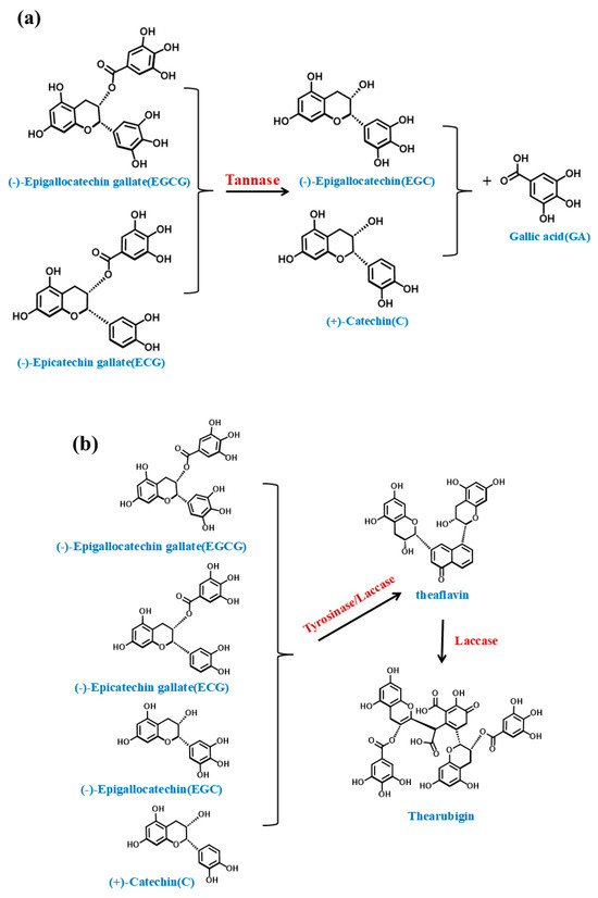 Pathway of action of tannase (a) and tyrosinase and laccase (b) on catechins [5,17,21].