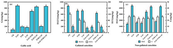 Contents of gallic acid (a), gallated catechins (b), and non-gallated catechins (c) in tea extract. GA: gallic acid; EGCG: (−)-epigallocatechin gallate; ECG: (−)-epicatechin gallate; EGC: (−)-epigallocatechin; and C: (+)-catechin. The error bar represents the standard error of the mean, and by the LSD test, the average of different lowercase letters indicates a significant difference (p < 0.05).