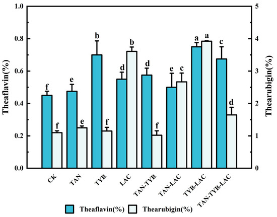 Content of theaflavins and thearubigins in the tea extract. The error bar represents the standard error of the mean, and by the LSD test, the average of different lowercase letters indicates a significant difference (p < 0.05).