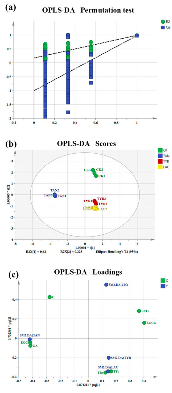 To better analyze the differences in the effects of tannase, tyrosinase, and laccase on Rock Tea extract, the OPLS-DA method was utilized in this study. Based on the contents of GA, EGCG, ECG, EGC, C, theaflavins, and thearubigins in the extract, the difference in the contribution rate of the three enzyme treatments to the extract components was analyzed. To verify the accuracy of the established OPLS-DA model, 200 permutation tests were performed for internal validation (Figure 11a). The permutation test results showed that R2 = (0.0, 0.173) and Q2 = (0.0, −1), where R2 < 0.4 and Q2 < 0.05. The slope was positive, and the regression line of Q2 intersected the vertical axis below the origin, indicating no overfitting of the model, making the results reliable [42]. The model scores chart, shown in Figure 11b, had values of R2x = 0.999, R2y = 0.989, and Q2 = 0.977, indicating a good fit to the model [1]. In the evaluation group, significant separation was observed between the different groups, indicating significant changes between the enzyme-treated samples and the control group. The changes caused by tyrosinase and laccase were similar; however, a considerable difference between tannase and the other two enzymes was observed. In the OPLS-DA loading diagram, tannase was the furthest away from and in the negative direction of EGCG and ECG, indicating that tannase effectively reduced the levels of these two gallated catechins. Moreover, the theaflavin and thearubigin contents were more closely related to those of tyrosinase and laccase (Figure 11c), likely because these two polyphenol oxidases significantly influence the formation of theaflavins and thearubigins.