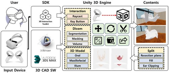 In response, medical education institutions are exploring ways to improve practical and clinical training and address the limitations of 3D CAD tools, conducting related research in collaboration with companies and research institutions. In particular, studies on practical and clinical training or surgical planning using virtual reality (VR) and augmented reality (AR) technologies are actively underway, with the effectiveness of research results applying VR and AR being validated [3,4,5,6,9,10,11]. VR enables the cost-effective replication of various environments and scenarios, and the display of 3D models in virtual space allows for intuitive navigation and manipulation. This makes surgical planning easily achievable even with minimal proficiency, while its user-friendly and straightforward UI facilitates the seamless utilization of various features [3,4,6]. In the case of AR, it allows for intuitive navigation and manipulation of augmented 3D models in real-world environments, achieving high educational effectiveness. Additionally, it provides real-time surgical guidelines or navigation information during surgery, enhancing accuracy [4,5,6].