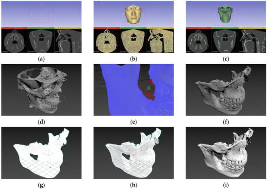 Process for generating the facial bone 3D model: (a) Step 1, DICOM file loading; (b) Step 2, 3D model generation and select segmentation; (c) Step 3, masking; (d) Step 4, volume rendering; (e) Step 5, mesh removal; (f) Step 6, mesh detachment; (g) Step 7, mesh reconstruction; (h) Step 8, mesh retopology; and (i) Step 9, texture mapping.