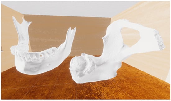 Exploration, manipulation, and resection tasks on the iliac and facial bone in a virtual environment require a visualization process. For this, the models are saved in formats such as DXF, OBJ, and FBX, which include the geometric structure, colors, and material information of 3D models. These formats are compatible with virtual environment creation software like Unity (San Francisco, CA, USA). In the virtual environment, users can use the controller buttons to open a file browser, select the desired iliac bone or facial bone model, and visualize it in the virtual space. The virtual space consists of simple rectangular walls, with rigid body properties assigned to the walls to prevent overlapping or passing through them during model manipulation. Figure 3 shows the visualization of the model in the virtual environment.