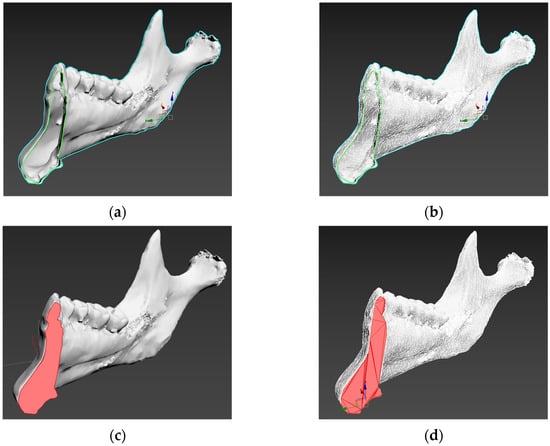 The proposed simulator is developed using Unity (Unity, San Francisco, CA, USA). However, Unity does not provide a function for generating meshes in the resection areas. Therefore, an algorithm is required to generate meshes in the resection areas, and the ear clipping [49,50,51] algorithm from the fill method is utilized. Ear clipping is a method for dividing a polygon into triangles by creating triangles along the boundaries of the cut faces to fill the empty space. This method has the advantage of requiring less computational load when generating triangular meshes compared to other mesh algorithms, making it simpler to implement and apply. To generate meshes for the resected areas of the model using the ear clipping technique, three vertices that can form a triangle are identified from the vertices of the cut faces along the resection plane. Then, the presence of other vertices within the triangle formed by the three vertices is checked. If no other vertices are present, a triangle is created. This process is repeated to fill the empty space in the resected area with new triangles, completing the mesh. Finally, to ensure smooth rendering and apply textures to the newly created meshes, the normal vectors and UV coordinates of each triangle are set. Figure 4 shows the generated mesh in the resected area of the maxillofacial model using ear clipping.