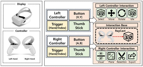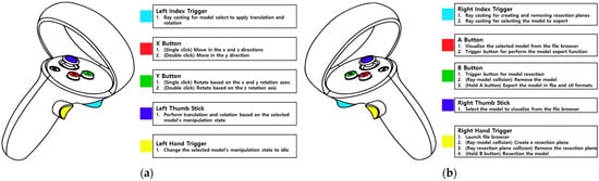 In the maxillofacial reconstruction surgery VR simulator, interaction is carried out through controllers. The controllers are divided into left and right controllers, each consisting of a thumbstick, one menu button, two buttons (right: A/B; left: X/Y), and two trigger buttons (index trigger and grip trigger). Controller-based interaction is achieved using the raycasting technique. A ray is emitted from the model in the forward direction, synchronized with the movement of the controller. If the ray makes contact with the model within a specific time frame, the object is considered selected. Then, the thumbstick and controller buttons are used to perform tasks such as visualization, manipulation, and resection of the model. Figure 5 shows the interaction method using the HMD controller. Figure 6 shows the functions assigned to the left and right controller buttons.