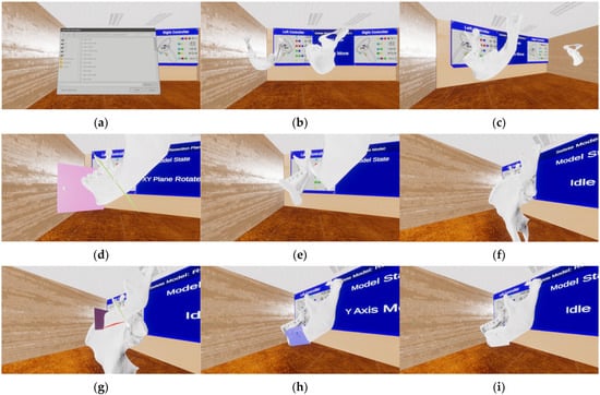 Based on the proposed approach, a maxillofacial reconstruction surgery simulator was implemented. The virtual environment for the simulator was created using Unity, and the CT-based iliac and facial bone models were developed using Slicer 5.6.2 and 3Ds Max 2024.2. An Oculus Quest 2 HMD was utilized to provide an immersive experience, with Android SDK, Android NDK, and Oculus SDK employed for seamless integration with Unity. Interaction within the simulator was facilitated through the Oculus Quest 2 controllers, and custom interaction modules were developed using C# scripts. A graphical user interface (GUI) was provided within the virtual environment, enabling real-time visualization of the selected models and the current interaction state. The implemented simulator was capable of generating maxillofacial reconstruction surgery models through a total of seven steps. Figure 7 shows the process of creating reconstruction models using the VR simulator.