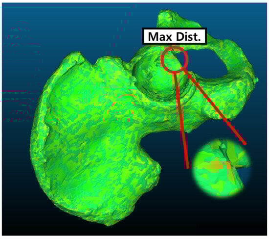 Model accuracy validation is performed to confirm the validity of the implemented maxillofacial reconstruction surgery simulator. This validation assesses the accuracy of the maxillofacial reconstruction model generated through the simulator. Through this, the accuracy of maxillofacial reconstruction, the reliability of the simulator, and the consistency of surgical planning can be confirmed. To validate the accuracy of the simulator-generated maxillofacial reconstruction model, the open-source software CloudCompare v2.14 is used. The comparative evaluation is conducted based on CT data from 10 patients who underwent maxillofacial reconstruction surgery using the iliac bone, and the comparison method involves shape comparison between models created by a maxillofacial surgeon using both a medical CAD tool and the simulator. For shape comparison, CloudCompare v2.14 is used to perform surface distance analysis and generate heatmaps, quantifying the differences by calculating the distance between the surfaces of the two models and visually comparing them through heatmaps. The surface distance analysis confirms the geometric precision of the simulator-based maxillofacial reconstruction model, and the model overlay analysis evaluates the surface congruency of the simulator-based model. Table 4 shows information derived from the distance calculations, and Figure 8 shows an example of heatmap generation using iliac models.