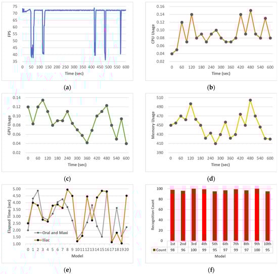 Graphs of the recorded performance evaluation metric results: (a) FPS; (b) CPU usage; (c) GPU usage; (d) memory usage; (e) resection time; and (f) recognition accuracy.