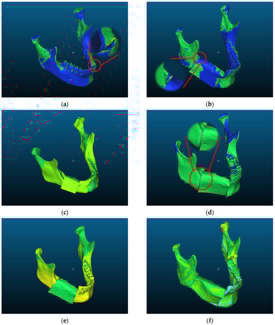 As mentioned in Section 2.5, the accuracy of the maxillofacial reconstruction models generated by the maxillofacial reconstruction surgery simulator was evaluated. A maxillofacial surgeon applied medical CAD software, Mimics 17.0, and the implemented simulator to create reconstruction models based on 10 patient datasets. The maxillofacial reconstruction models generated using Mimics 17.0 were defined as the target models, while those generated by the simulator were defined as the test models. First, surface distance analysis was performed by applying the target and test models to CloudCompare v2.14. To ensure accurate results, fine registration was conducted to align the positions of the target and test models, and surface distances between the two models were calculated using the Mesh Distance function. Table 7 shows the results of the surface distance calculations between the 10 target and test models.