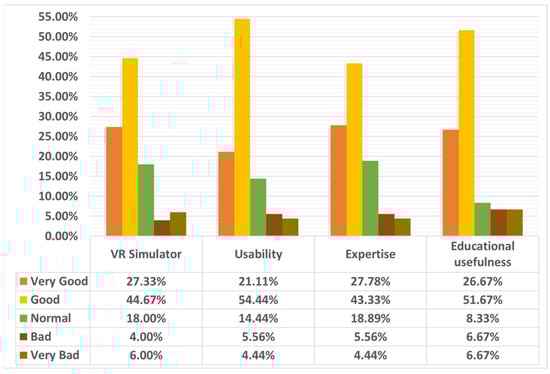 For the VR simulator category, 27.33% of responses were very good, 44.67% were good, 18.00% were normal, 4.00% were bad, and 6.00% were very bad, with 72% of the responses being positive. For the usability category, 21.11% of responses were very good, 54.44% were good, 14.44% were normal, 5.56% were bad, and 4.44% were very bad, with over 75% of the responses being positive. For the expertise category, 27.78% of responses were very good, 43.33% were good, 18.89% were normal, 5.56% were bad, and 4.44% were very bad, with over 71% of the responses being positive. For the educational usefulness category, 26.67% of responses were very good, 51.67% were good, 8.33% were normal, 6.67% were bad, and 6.67% were very bad, with over 78% of the responses being positive.