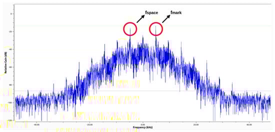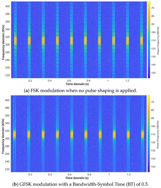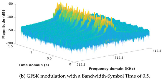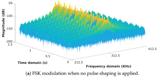 In general, GFSK has a higher spectral efficiency compared to FSK. The Gaussian pulse shaping filter smooths the symbol transitions and, therefore, is more bandwidth-efficient because it reduces the amount of sidelobes. In this way, it also reduces Inter-Channel Interference (ICI). The effect of FSK- and GFSK-modulated signals can be seen in a two-dimensional and three-dimensional view in Figure 3 and Figure 4, respectively. The energy is much more spread in the frequency domain when no pulse shaping is applied, whereas the energy is more concentrated when a Gaussian pulse shaping step is implemented.