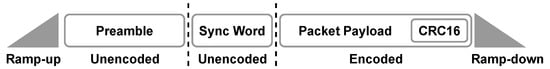 DASH7-mappedpacket structure as seen in the time domain. The figure shows the preamble followed by the sync word and the whitened payload, respectively.