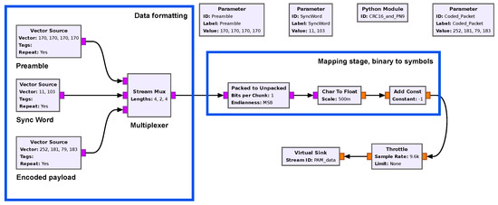Packet to symbols conversion flowgraph. The data formatting box exploits three vector sources and a multiplexer block. The respective parameters control the values of the vector sources. The second blue-framed box implements the mapping of the bytes to real values. The byte’s parallel values are converted into a series of symbols, where the 0 b is represented by −1 and the 1 b is represented by 1. The mapped packet is presented in Figure 7.
