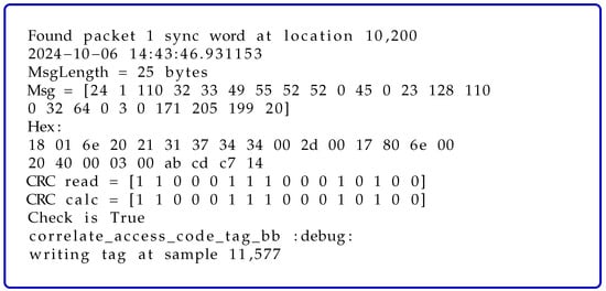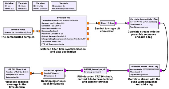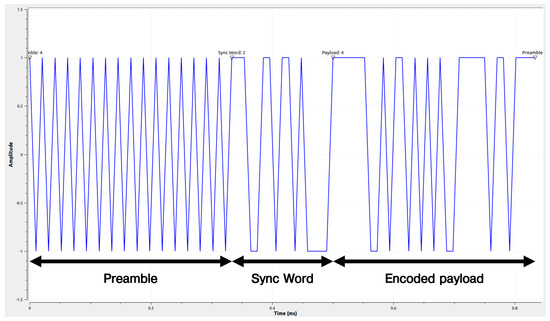 The data formatting box in Figure 6 exploits three Vector sources and a Multiplexer block. The vector sources are dedicated to the preamble, the sync word, and the payload data. Subsequently, the Binary to symbols box converts each bit into a series of bytes and creates symbols by mapping these values. The 0 b is represented by −1, and the 1 b is represented by 1. The Throttle block is added to control the throughput of the data flow. In this case, we transmit a Lo-Rate DASH7 signal with a symbol rate of kbps. The Virtual Sink block, in the flowgraph, is used for organizational purposes. Note that the Virtual Sink needs to be linked with a Virtual Source so that the data flows between the sink and the source. The complete transmitted packet is presented in Figure 7. The figure clearly shows the preamble data followed by the sync word and the whitened payload.