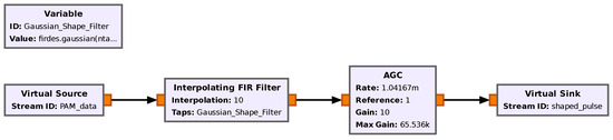 In GNU Radio, we utilize the Interpolating FIR Filter block to simultaneously perform the upsampling and shape filter processes. This filter creates a Finite Impulse Response (FIR) filter that performs the convolution in the time domain between the payload symbols and the filter taps, which happens after upsampling the bits by the SPS factor in the interpolation process. Consequently, if the taps are set to ones, then the output waveform will have a rectangular pulse shape. However, we deployed a Gaussian shape filter defined by the variable Gaussian_Shape_Filter. This variable exploits the GNU Radio firdes.gaussian(gain, SPS, beta, ntaps) function. The gain and SPS parameters are self-explanatory at this point, while beta is a Gaussian filter parameter ranging between 0 and 1. The parameter beta represents the product between the 3 dB bandwidth of the Gaussian filter and the symbol duration, i.e., BT, where B is the bandwidth and T is the symbol duration. For instance, if beta equals 0.25, then the Gaussian pulse shape spreads over four symbols. Thus, a smaller beta causes a higher Inter-Symbol Interference (ISI) but a compact spectrum. Finally, the ntaps variable specifies the amount of FIR taps. The choice of the number of taps (ntaps) is a trade-off between the filter performance and computational cost. A long tap line will ensure a compact signal bandwidth and good phase and amplitude responses for the signal of interest. A more expanded description regarding FIR filter design can be found in [24]. In our implementation, the ntaps parameter is equal to the SPS parameter because we usually deploy a high SPS factor. The implementation can be seen in Figure 8. We apply an Automatic Gain Control (AGC) block to the output of the Interpolating FIR filter block to obtain a more normalized signal after the pulses are amplified and shaped.