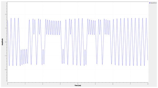 In the previous section, the complete DASH7 packet is formatted and converted to symbols. In this section, the symbols (see in Equation (9)) will be converted to a waveform. Consequently, every symbol will have a transmission time. Therefore, a single symbol will be represented by multiple samples. In our presentation, the symbols take the values of [−1,1] and are converted directly from the binary data [0,1]. However, the samples represent the digital waveform that will be transmitted. Therefore, the sample rate will always be larger than the symbol rate.