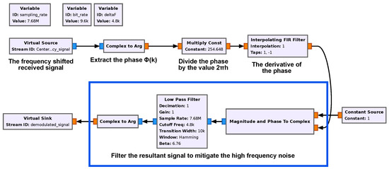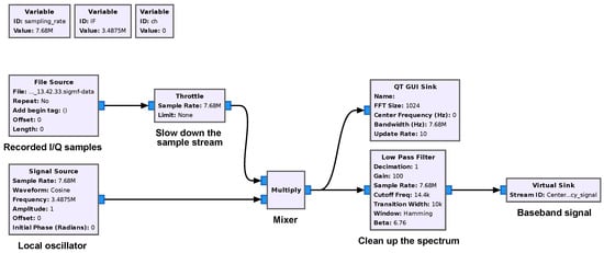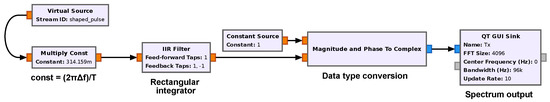 GNU Radio is a set of free and open-source tools aiming to implement SDR systems and provides ready-to-use signal processing blocks [20]. It can be used with COTS SDRs or in a simulation mode. It can be used to write applications, to receive data out of digital streams, or to push data into digital streams, which can be transmitted using specific hardware. GNU Radio contains a variety of blocks such as filters, channel coders, synchronisation elements, equalizers, demodulators, decoders, and many other elements that are typically found in software radio systems. These elements are readily available as software blocks. More importantly, it includes a method of connecting these blocks and then manages how data are passed from one block to another. Adding extra DSP functions can be achieved with the use of embedded Python blocks. These blocks allow the implementation of custom Python code.