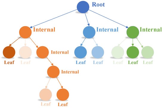 Decision trees are rule-based algorithms used to solve classification and regression problems. It is one of the most appropriate algorithms used in classification and prediction processes because of its ease of understanding and interpretation [63]. An example of the decision trees consisting of roots, knots, and leaves is shown in Figure 1. The root nodes are at the top, the internal nodes are in the middle, and the leaf nodes are located at the bottom.