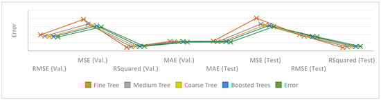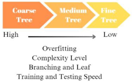 Coarse tree is a structure in which branches and divisions of trees have a higher degree of complexity with deeper fissures. The level of complexity is higher because of the high twisting and depth. It is more convenient to use it for the evaluation of larger dataset details. Decision points can make the details come to light better. However, there is a risk of over-adaptation in the dataset. This increases the likelihood of overfitting against noise and non-pattern data in the data. It is used both in high-resolution datasets and in complex structures leading to lengthy training and test periods [66]. The complexity of the fine trees, medium trees, and coarse tree trees, the number of leaves, the training and test time, and the overfitting comparison are shown in Figure 2.
